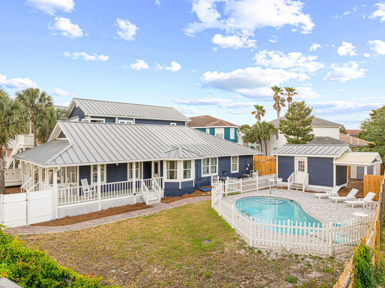 - Blue House: 5 bedrooms with 4 downstairs and one upstairs (upstairs unit acts a 1 bedroom apartment) + Pool